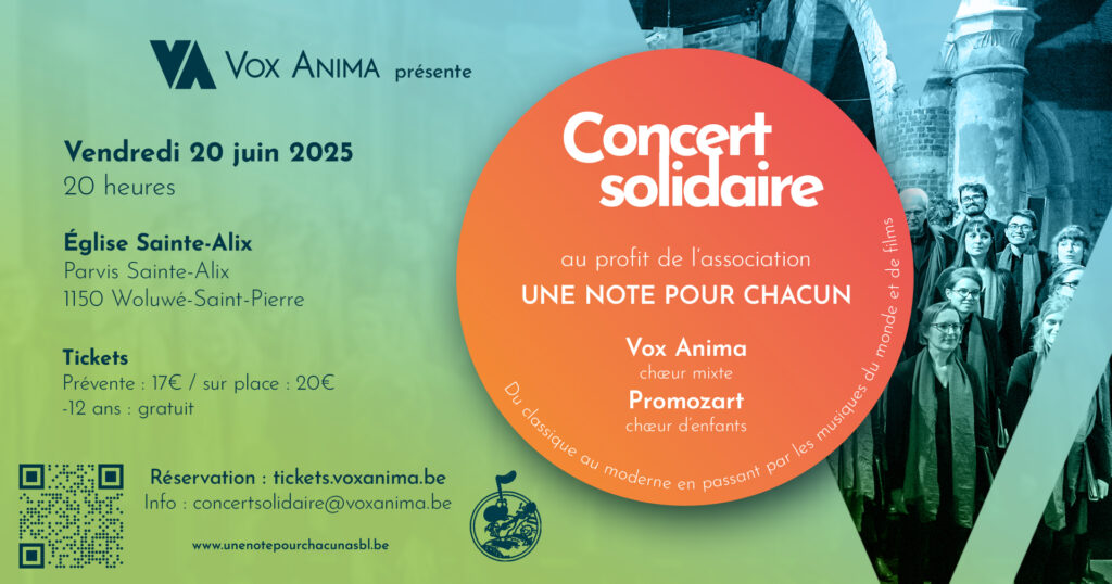 Vous pouvez réserver vos places auprès de Vox Anima en scannant le QR Code de l’affiche ci-dessus ou en cliquant sur ce lien.